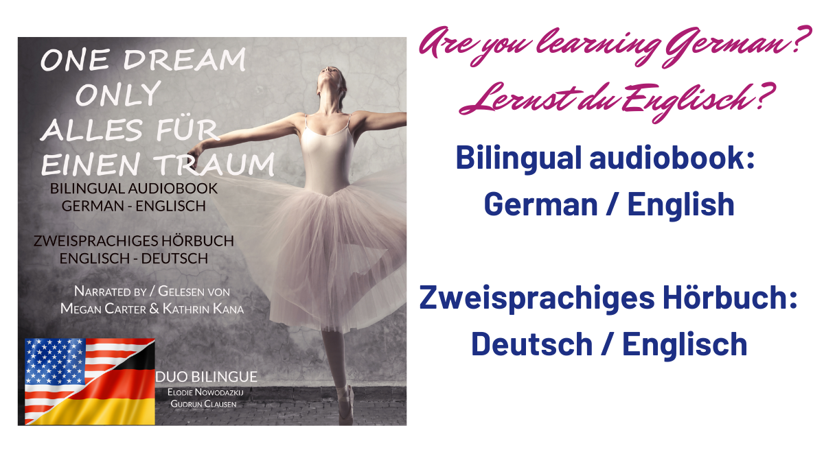 Lernst du Englisch? Are you learning German? This bilingual audiobook can help you with that: one chapter in English, one chapter in German …Dieses zweisprachigeHörbuch kann dir dabei helfen: ein Kapitel auf Englisch, ein Kapitel auf Deutsch…(narrated by Megan Carter & Kathrin Kana, gesprochen von Megan Carter & Kathrin Kana).