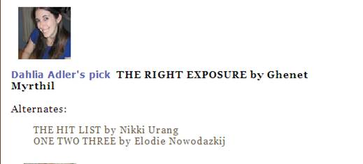 I ended up being selected by the truly wonderful Dahlia as an alternate. The very talented Ghenet was her first pick and the lovely Nikki Urang was her other alternate. (by the way Nikki is getting published next year, you should totally add her book to Goodreads).