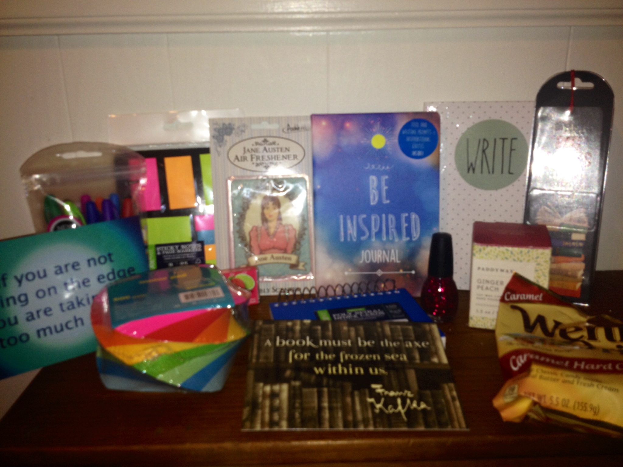 Be Inspired Journal with Inspirational Quotes and Writing prompts Jane Austen Air Freshener Sticky Notes and Page Markers I like BIG BOOKS and I cannot lie! Bookmark Poly Spiral Index Cards WRITE Journal/Composition Book Werther’s Originals Caramel Hard Candies Paddy Wax Ginger Peach Soy Wax Candle Trident Island Berry Lime Gum Spiral Memo Pad in a rainbow of colors Sinful Colors Decadent Nail Polish Post cards with Inspirational Quotes Mini Ink Joy Pens