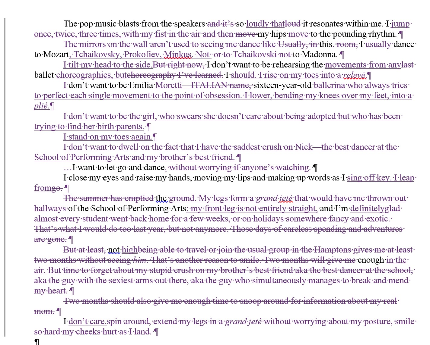 And below you’ll see the differences between then and now. All the track changes in purple are words/sentences I either added or deleted.