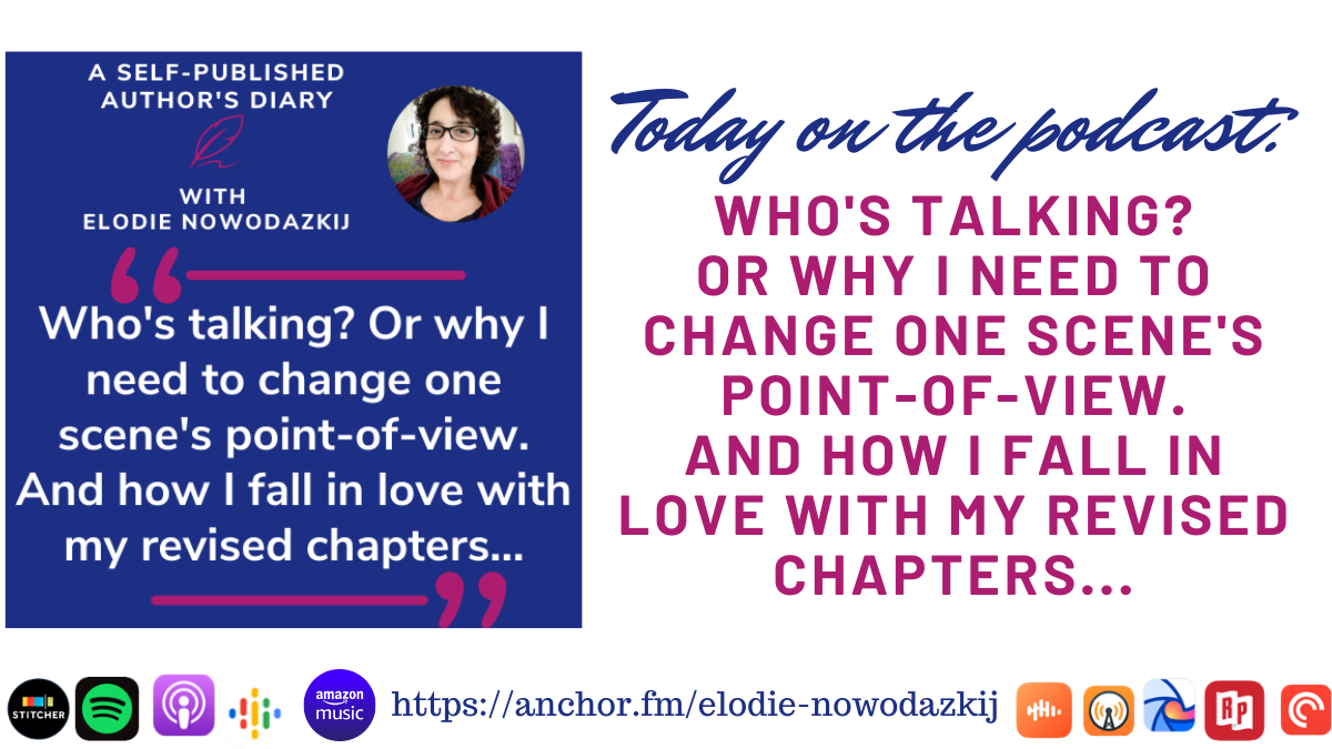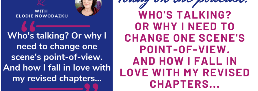 Today, I talk about needing to change one scene’s point-of-view and the process behind that decision (mainly related to which character needs to have a certain realization). I also discuss falling in love with my revised chapters, when I no longer focus on each page, paragraph, sentence, word and re-read the whole chapter on a different device than my computer…