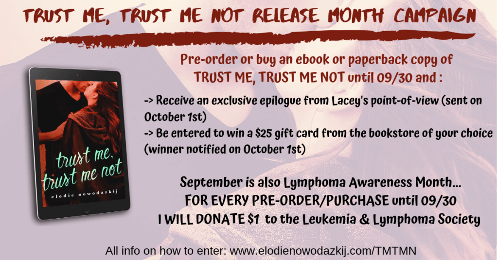 For every purchase of TRUST ME, TRUST ME NOT during September, I’ll donate $1 to the Leukemia & Lymphoma Society.